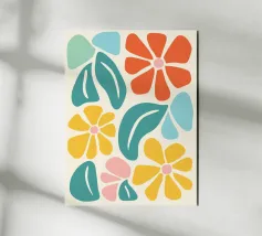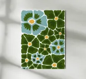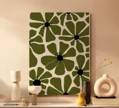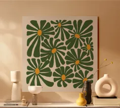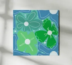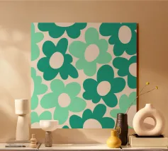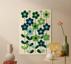Een patroon van gestileerde bloemen met grote groene bloemblaadjes en kleinere lichtblauwe bloemblaadjes, elk met een geel hart. Het ontwerp is abstract en repetitief en straalt een gedurfde en moderne esthetiek uit.