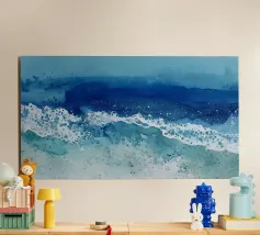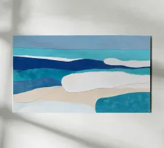 Deze abstracte aquarel is gelaagd in rijk groenblauw en licht aqua en vloeit als de verschuivende getijden tegen een stille kustlijn. Een mix van vloeiende verlopen en zachte randen legt de stille beweging van de zee vast - kalm, ruw en eindeloos in ontwikkeling.