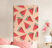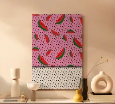 Deze verfrissende digitale poster heeft een speels, herhalend patroon van levendige watermeloenplakken. Elk schijfje is afgebeeld met sappig rood vruchtvlees, donkere pitjes en een knapperige groene schil, allemaal verspreid over een zachte, bleke perzikachtergrond. De vrolijke kleuren en het repetitieve motief creëren een leuke, zomerse en popart-esthetiek. Deze digitale poster van hoge kwaliteit, aangeboden op 7000x5000 pixels en 300 dpi, brengt uitstekende kunst en een vrolijke, frisse sfeer in elke ruimte.