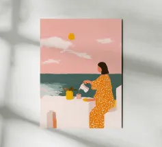 Een rustige avondscène van een vrouw en haar kat zittend bij open deuren, omringd door weelderige planten en zacht maanlicht. De zachte compositie voelt dromerig en vrouwelijk met strakke lijnen en pastelkleuren. Gemaakt om een beetje stilte en langzame levensenergie in je dag te brengen.