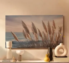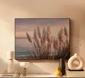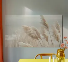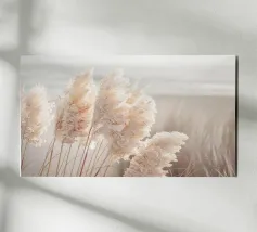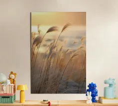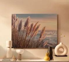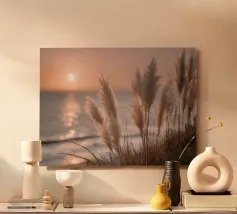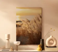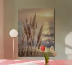 Het pampagras aan de oever rijst op als een delicate droom; filigraan, licht, bijna gewichtloos. De lucht glinstert in zachte tinten roze, abrikoos en lavendel over het stille water. De lucht lijkt vol poëzie, alsof elke stengel een klein verhaal vertelt over de vrede van de avond. Geen enkel geluid verstoort de harmonie. De compositie straalt pure zachtheid uit, een pauze in het moment. Ideaal als meditatieve natuurfoto voor kamers die rust, ruimte en elegantie moeten uitstralen. Deze foto geeft het alledaagse leven een zachte ontsnapping naar het dromerige.