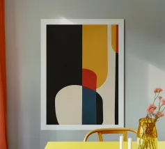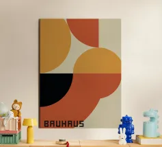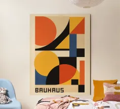 Moderne, op Bauhaus geïnspireerde poster in krachtige kleuren en heldere vormen. Combineert strenge geometrie met zachte rondingen - een tijdloos designstatement voor woon- en werkruimtes.