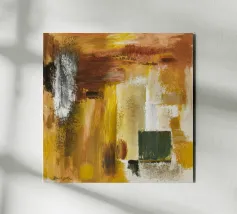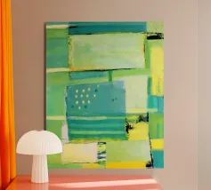 Een abstract kunstwerk met een rustgevende opstelling van vierkante en rechthoekige vlekken in verschillende tinten groen, bruin en beige, die doen denken aan een sereen patchworkveld of een rustig oppervlak met textuur. Bob Nugent-stijl.