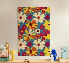 Een levendige lappendeken van verschillende patronen en motieven, een combinatie van bloemenelementen, abstracte vormen en tegelmotieven. De eclectische mix van kleuren en stijlen creëert een visueel rijke en vrolijke compositie die doet denken aan een mediterrane tegelwand.