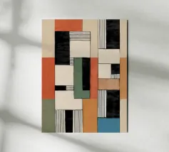 Een dynamische collage van botsende patronen en texturen, waaronder stippen, strepen en abstracte krabbels. De compositie in beige, zwart en rood is een gedurfd en eclectisch statement dat de creatieve chaos viert.