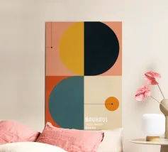Dit moderne kunstwerk combineert heldere vormen met zachte kleurovergangen in abrikoos, rosé en petrolblauw. De minimalistische compositie met twee halfronde vlakken creëert rust, evenwicht en stijlvolle esthetiek. Perfect voor moderne interieurs, Scandinavische interieurs en iedereen die houdt van rustige muurkunst met een kleuraccent.