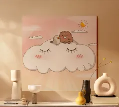 Dit kunstwerk toont een chagrijnige wolk met een gedachtewolkje met daarin een vogel en een beer. Het humoristische en fantasierijke tafereel speelt zich af tegen een zachtblauwe achtergrond.