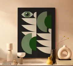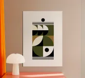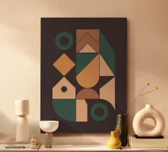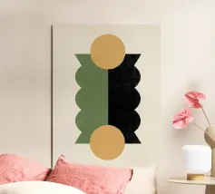 Dit werk, getiteld "Interplay", is een studie naar geometrische compositie en kleurenharmonie. Het werk wordt gedefinieerd door een verticale rechthoek en bestaat uit een complexe maar evenwichtige opstelling van ronde en rechtlijnige vormen tegen een warme, neutrale achtergrond. De compositie verkent de dynamische relatie tussen positieve en negatieve ruimte en maakt gebruik van een beperkt palet van zwart, olijfgroen, warme tinten en crème om een gevoel van zowel stabiliteit als beweging te creëren. De precieze stapeling en segmentatie van de vormen benadrukken een boeiend samenspel van symmetrie en asymmetrie.