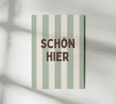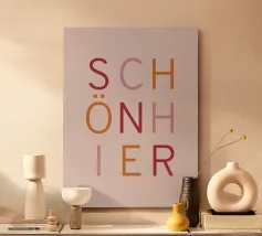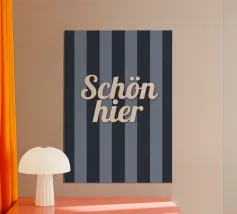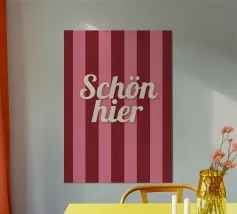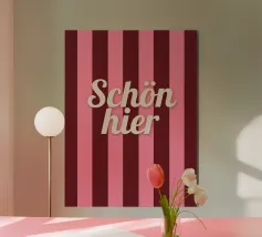 Deze moderne typografische poster met de tekst "Schön hier" ("Leuk hier") zorgt voor een goed humeur en een positief gevoel in huis. De krachtige kleuren en heldere vormen maken het een stijlvol hoogtepunt voor de woonkamer, hal of thuiskantoor.