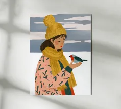 This artwork shows a person in a red sweater holding a rooster. The background is dark, highlighting the rustic and charming elements of the scene.