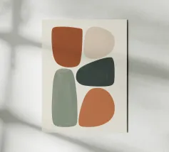 Een minimalistische abstracte compositie van gestapelde organische vormen in gedempte aardetinten. De vloeiende aquareltexturen en fijne lineaire detaillering roepen balans, rust en natuurlijke orde op, terwijl de moderne, Scandinavisch geïnspireerde esthetiek behouden blijft.