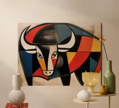 A commanding abstract portrayal of a bull’s head, constructed from layered planes, distressed textures, and intense tonal depth. Set against a powerful red field, the form feels monumental and symbolic, evoking strength, resolve, and raw presence. Fragmented surfaces and collage-like detailing add complexity, giving the piece a sense of history and weight beneath its bold exterior.