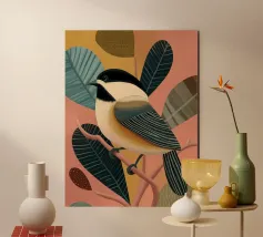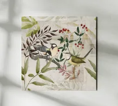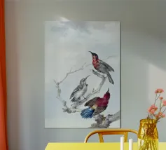 Een rustig tafereel van drie mussen op takken met eenvoudige bladeren.