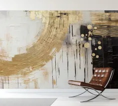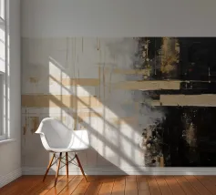 Modernes abstraktes Grafikdesign mit einem Hauch von Eleganz. Experimentelle Vektormalerei mit verschiedenen Pinseln in Schwarz und Weiß mit goldenen Highlights. Dynamisches und sehr ansprechendes zeitgenössisches Design.