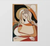 Dit kunstwerk toont een abstracte figuur in een zittende houding, omringd door geometrische vormen en gedempte kleuren. Het gebruik van beige, bruine en zwarte tinten creëert een gevoel van diepte en complexiteit. De houding van de figuur en de abstracte elementen in de compositie nodigen de kijker uit om na te denken over de betekenis en de emoties die het kunstwerk overbrengt.
