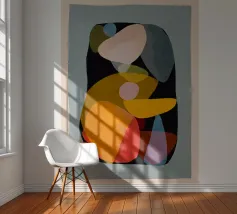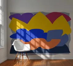 An abstract composition of overlapping, rounded shapes in yellow, orange, and deep blue, suggesting a reclining human form in a minimalist and fluid style, exploring the essence of shape and color.