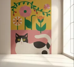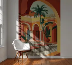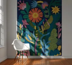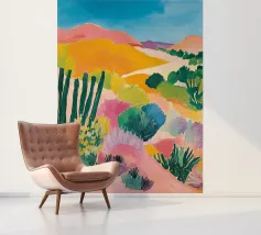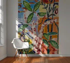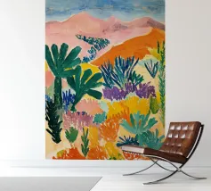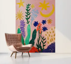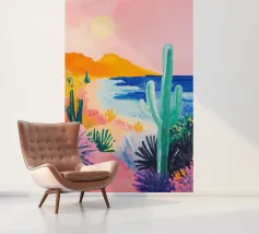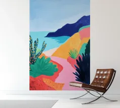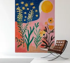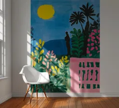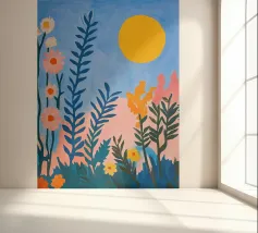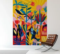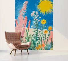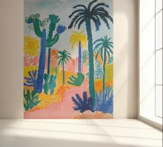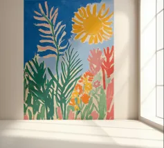 Een levendig, abstract landschap met een felle zon, palmbomen en gestileerde bloemen. De felle kleuren en moderne, grafische stijl creëren een energieke en vrolijke viering van een tropisch paradijs.