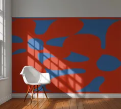 Abstracte vormen met gedurfde, vloeiende rode en blauwe vormen creëren een levendige, dynamische compositie. De toevoeging van gele lijnen voegt contrast en beweging toe aan het ontwerp.