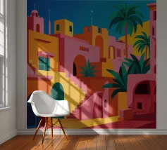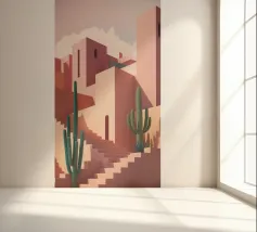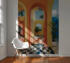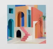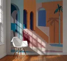 Een surrealistische architectonische compositie van bogen, trappen en deuropeningen in een zacht pastelpalet van roze, blauw en beige. Een eenzame palmboom voegt een vleugje natuur toe aan dit rustige en droomachtige labyrint.