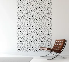 Dit zwart-wit kunstwerk met grafisch pijlpatroon heeft een moderne compositie van herhalingen, wat een gevoel van beweging en energie creëert. Het monochrome palet geeft een gevoel van eenvoud en elegantie. Het gebruik van pijlen symboliseert richting.
