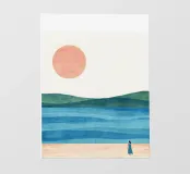A woman walks alone on a soft sandy beach, the sun is setting on the horizon in a warm orange colour, and the blue water is softly lapping. The painting expresses a sense of inner peace and connection