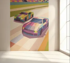 Een illustratie van een kleurrijke botsauto in een spelarena met een moderne geometrische stijl.