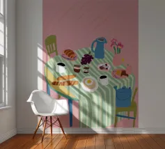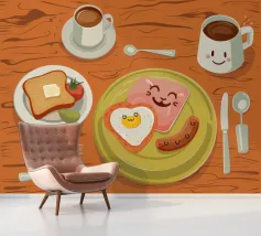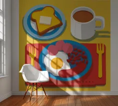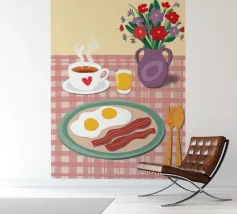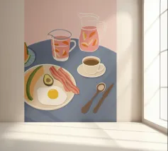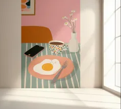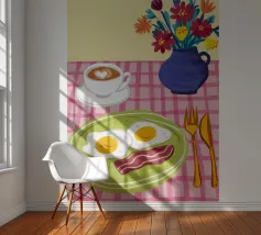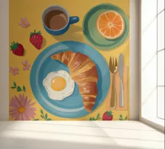 Een bovenaanzicht van een ontbijttafel met een croissant, spek, eieren, koffie en een brief. De stijl is modern, strak en legt een perfect ochtendmoment vast.