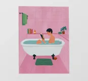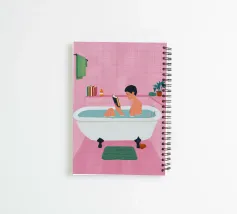 An overhead view of a person relaxing in a bubble bath, reading a book. The scene in a pink tiled bathroom is a perfect depiction of self care, tranquility, and peaceful escape.