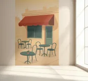 Minimalistisch ontwerp van een typisch klein Frans hoekcafé met kleine ronde tafels, rode luifel en schattige tafelplant. Decoratief ontwerp voor iedereen die houdt van heerlijke koffie in mooie cafés.