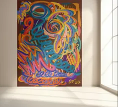 Dit abstracte schilderij met grafisch ontwerp combineert surrealistische krabbels met dynamische vloeiende lijnen en krachtige kleuren in rood, geel, blauw, wit, roze en groen. Het werk is geïnspireerd op expressionisme en action painting-technieken en straalt beweging en diepte uit. Complexe texturen en vertakkende patronen maken het tot een fascinerend stuk moderne kunst.