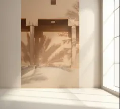 Licht en schaduw spelen prachtig onder een rustiek geweven baldakijn, met zacht linnen dat zachtjes wiegt in de wind. Een rustig moment van elegantie en eenvoud.
