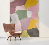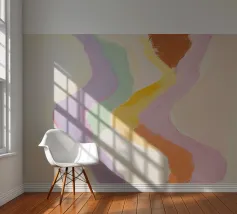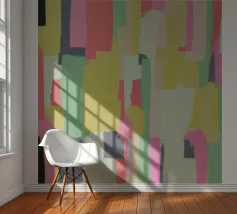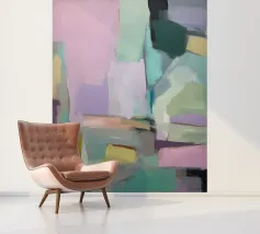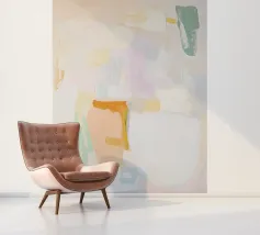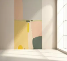 Abstract kunstwerk met grote penseelstreken in roze, geel, grijs, wit en lichtgroen op een witte achtergrond. De zachte randen en zachte kleuren geven het minimalistische ontwerp warmte, lichtheid en subtiele diepte.