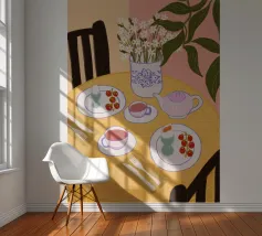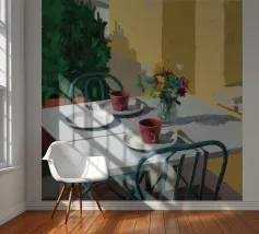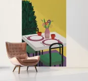 Een eenvoudige, moderne interieurscène van een gedekte tafel voor twee, met een vaas met bloemen als middelpunt. De gele muur en minimalistische setting creëren een sfeer van stille intimiteit en chique eenvoud.