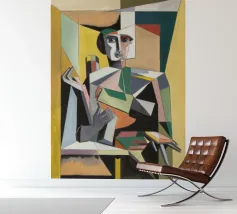 Dit kunstwerk toont een abstracte figuur in een dynamische pose, omringd door gedurfde vormen en kleuren. De compositie creëert een gevoel van beweging en energie.