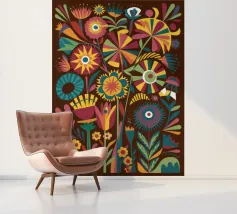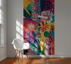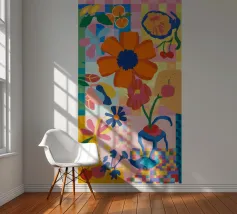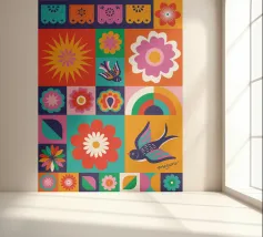 A vibrant patchwork of different patterns and motifs, combining floral elements, abstract shapes, and tiled designs. The eclectic mix of colors and styles creates a visually rich and joyful composition, reminiscent of a Mediterranean tile wall.