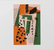 A dynamic collage of clashing patterns and textures, including dots, stripes, and abstract scribbles. The composition in beige, black, and red is a bold and eclectic statement, celebrating creative chaos.