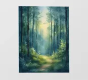 Een sereen aquarelschilderij van een zonovergoten pad dat door een weelderig groen bos kronkelt.