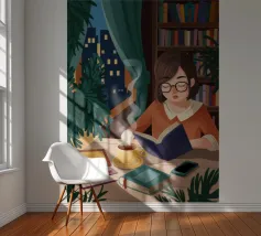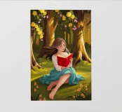 Een persoon zit op het gras in een sereen bos, verdiept in een boek. Warm gouden licht valt door de bomen en creëert een magische en rustige sfeer.