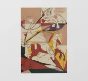 Dit schilderij toont abstracte figuren in levendige kleuren, waaronder rood, geel en paars. De compositie is levendig en vol energie.