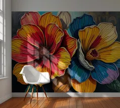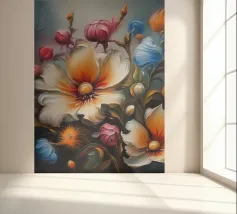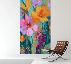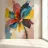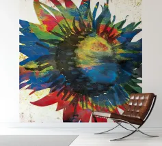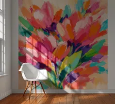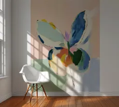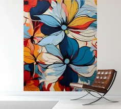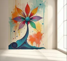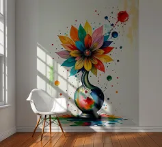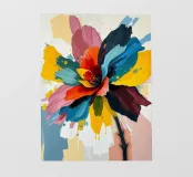 Dit levendige abstracte schilderij toont een dynamische bloem met meerdere bloemblaadjes die barst van de felle kleuren, waaronder diepblauw, rijk rood, helder geel, energiek oranje en zacht roze. De penseelstreken zijn los en expressief, met zichtbare texturen en verfspatten, waardoor een gevoel van beweging en spontaniteit ontstaat. Een donkere, bijna silhouetachtige steel omringt de caleidoscopische kleurexplosie, terwijl vleugjes wit en gedempte achtergrondtinten de levendige tinten echt laten knallen. De algemene indruk is er een van vrolijke energie en abstracte bloemenpracht.