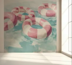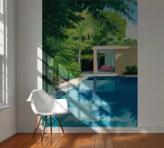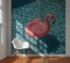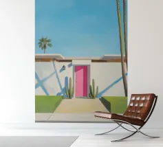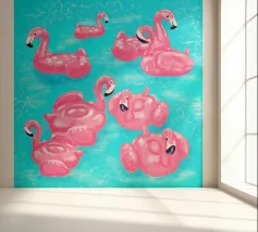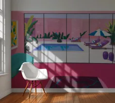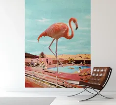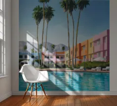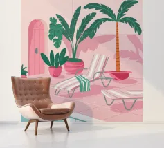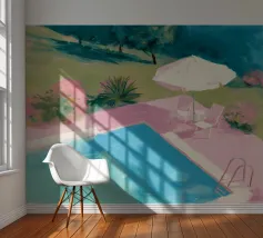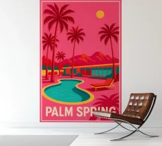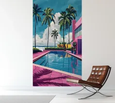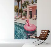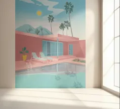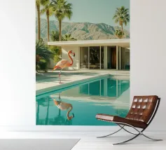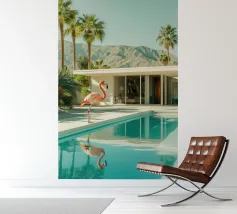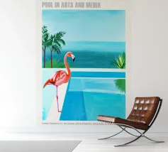 Een nostalgische Palm Springs scène: een roze flamingo zwemband drijft in een turquoise zwembad, omlijst door zachte pastelkleurige ligstoelen en torenhoge palmen. Dit kunstwerk brengt een retro zomersfeer, ontspannen vakantiestemming en mid-century charme aan elke muur - ideaal voor woonkamers, slaapkamers of een stijlvolle inrichting aan het zwembad.