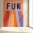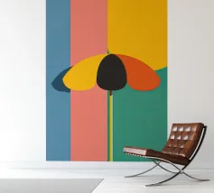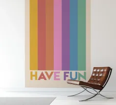 Minimalistische typografische illustratie met opvallende gekleurde strepen en een eenvoudig woord. Strakke, speelse compositie.