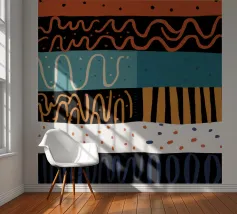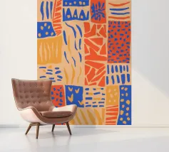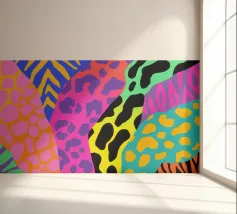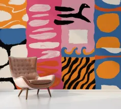 Een abstract kunstwerk samengesteld uit verschillende gestructureerde patches, waaronder dierenprints en effen kleuren zoals oranje en blauw, waardoor een visueel interessant en harmonieus modern patchwork ontstaat.
