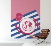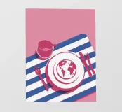 Een minimalistische en conceptuele illustratie van een enkel gedekte tafel op een gestreept tafelkleed, met een wereldbol op het bord. Het kunstwerk is een tot nadenken stemmende uitspraak over de wereldkeuken of reizen.
