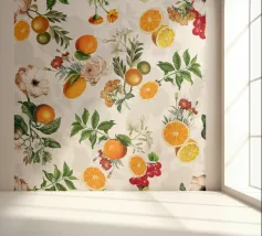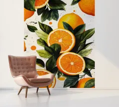 Een patroon met grapefruits en sinaasappels op een grijze en groene spetterachtergrond.