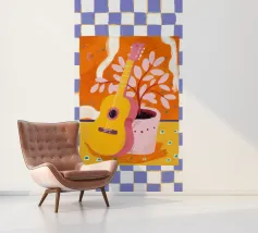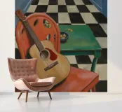 An acoustic guitar rests on a red chair beside a checkered floor, inviting stories in sound and solitude.