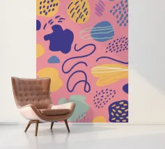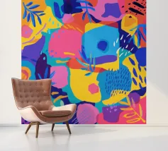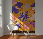 A vibrant yellow background is covered in a playful and chaotic pattern of abstract shapes, scribbles, and lines in blue, purple, and orange, creating a joyful and energetic design.