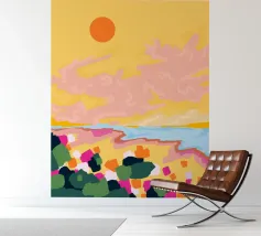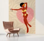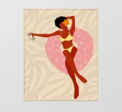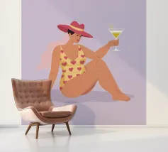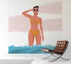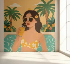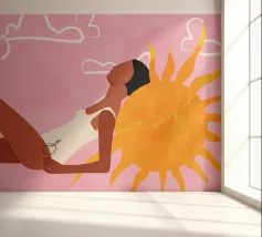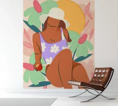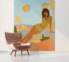 Een stijlvolle minimalistische illustratie van een vrouw in een gele bikini, loungend op een roze vlot in een tropische omgeving. De warme, zonovergoten tinten en retro-esthetiek roepen een gevoel van ontspanning en zomerse gelukzaligheid op. Perfect om een vleugje vakantiegevoel toe te voegen aan elke ruimte.