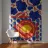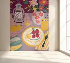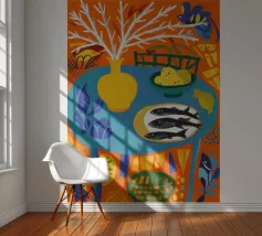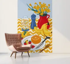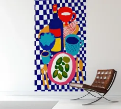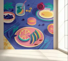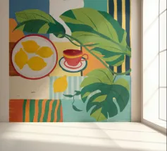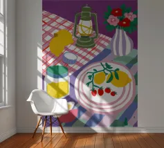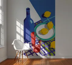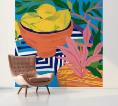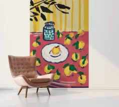 Een gedurfd, grafisch patroon met een citroenzonmotief, blauwe druiven of bloemen en rode vormen. De stijl is modern en heeft een pop-artachtige uitstraling.