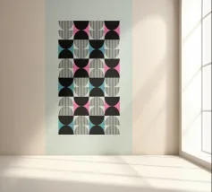 "Loopscape is een meeslepend werk dat herhaling transformeert in een visuele reis. Organische vormen - halve maantjes, golven, ellipsen - worden herhaald als rimpelingen en roepen een abstract landschap op. Elk motief gaat over in het volgende en creëert een illusie van langzame, bijna meditatieve beweging. Ideaal voor een modern interieur, dit stuk nodigt uit tot contemplatie en creëert een gevoel van constante harmonie.